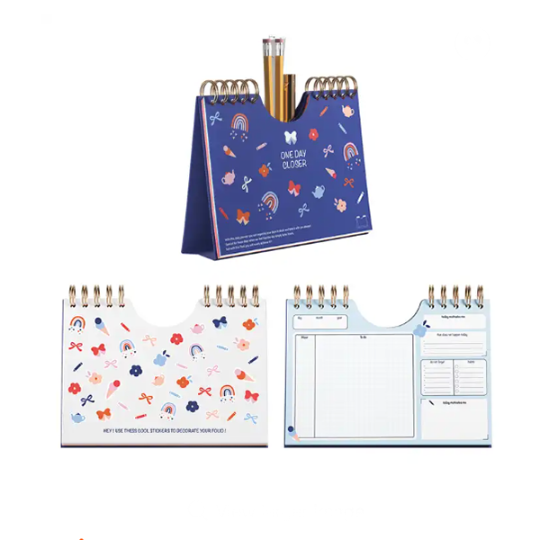 210x148mm 57g art paper+700g cardboard+120g paper 4C/0C printing mattlamination and die cut Wire-o binding alendars