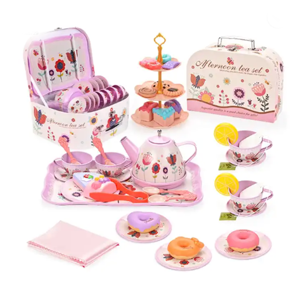 Chengji kids toy wholesale gifts pretend play kitchen food toy tea party girls play realistic tinplate pink tea set toy for kids
