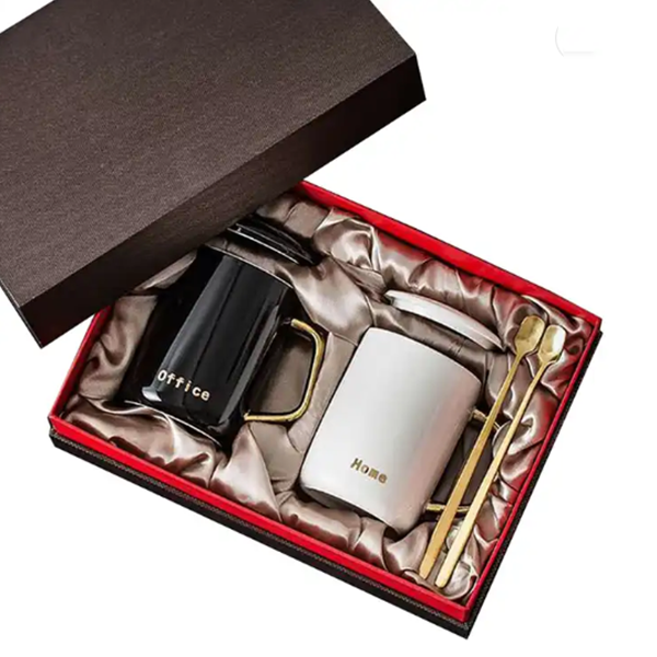Promotional nordic black white lid cup spoon birthday ceramic custom logo mug set gift box couple