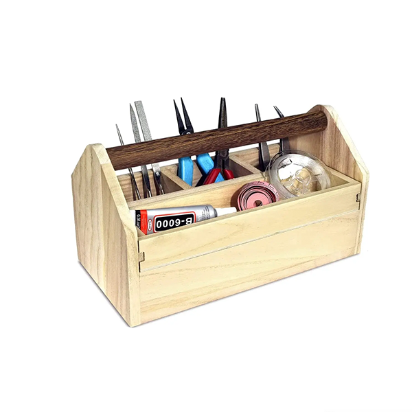 Small Natural Wood Color Wooden Craft Tool Box Caddy with a Handle for Storage Tool, Makeup, Collections with 5 Compartments